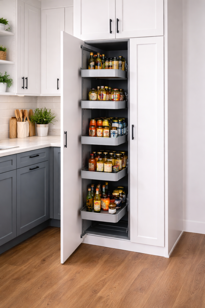 Pull-out pantry systems allow easy storage in narrow spaces.