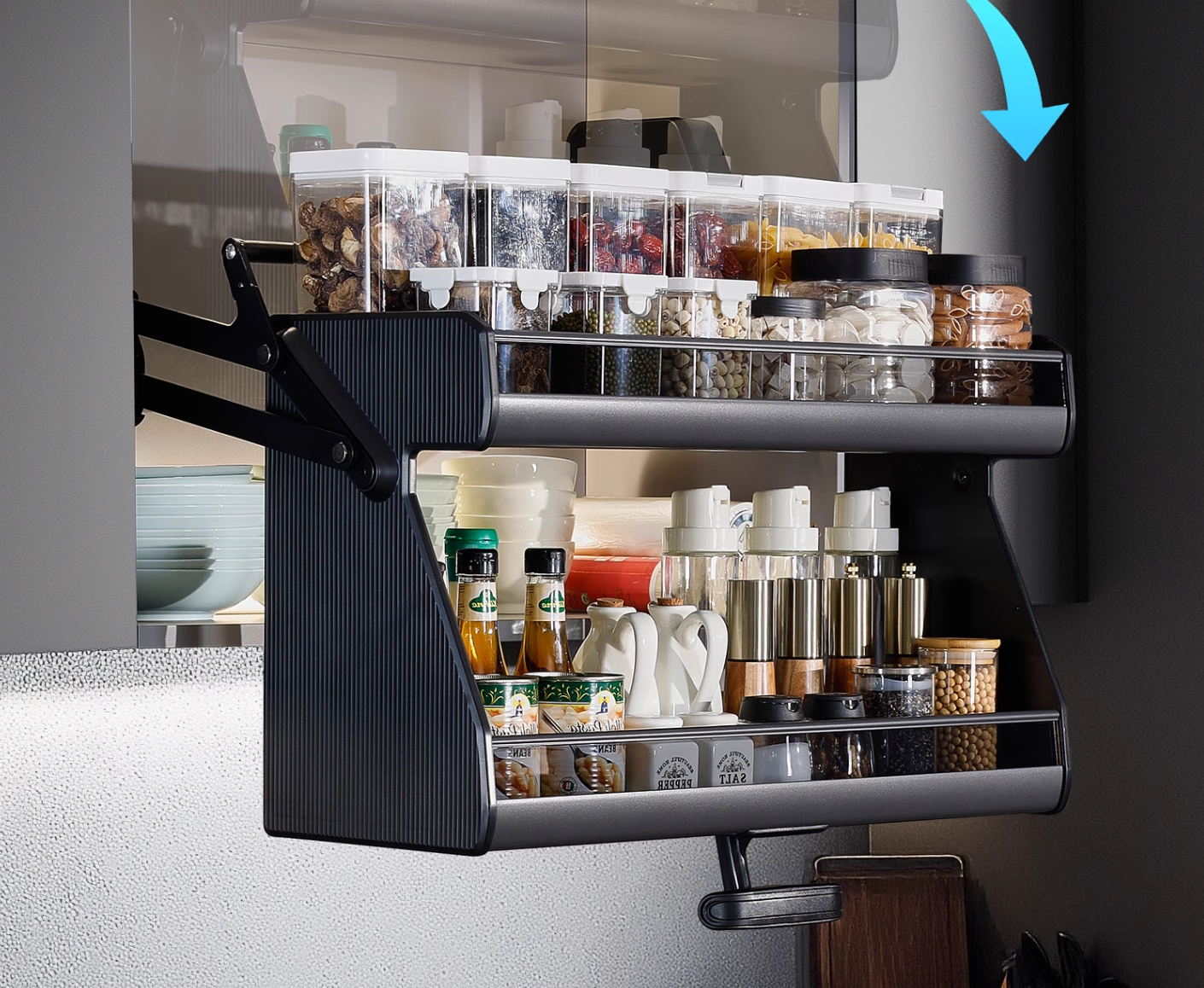 Overall, this pull down spice rack cabinet lift system is an excellent upgrade for modern kitchens. It enhances accessibility, improves storage efficiency, and creates a smart, organized, and functional kitchen environment without requiring major renovations.